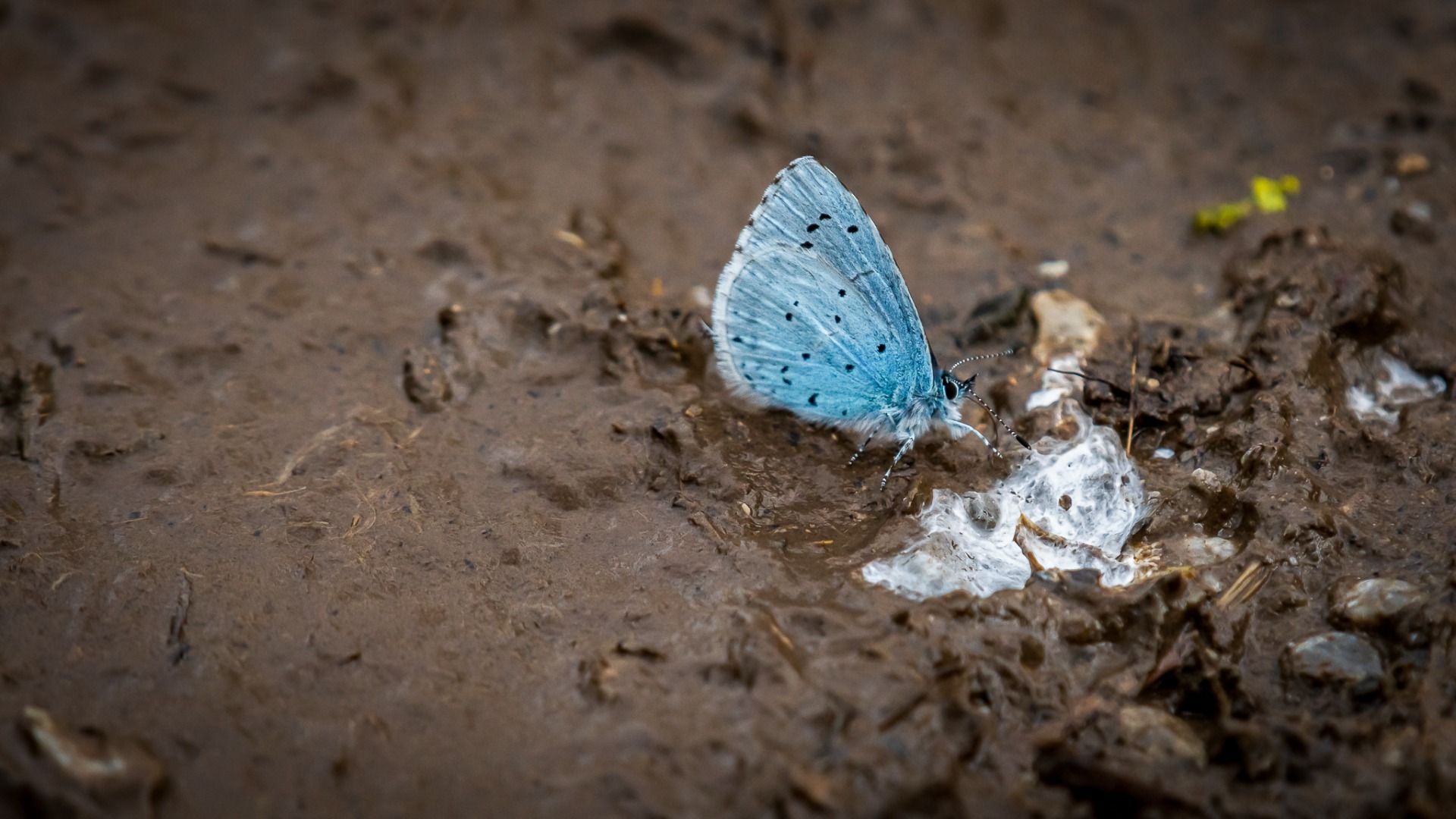 Holly Blue (Celastrina argiolus). Sometimes seen on muddy ground taking in minerals.