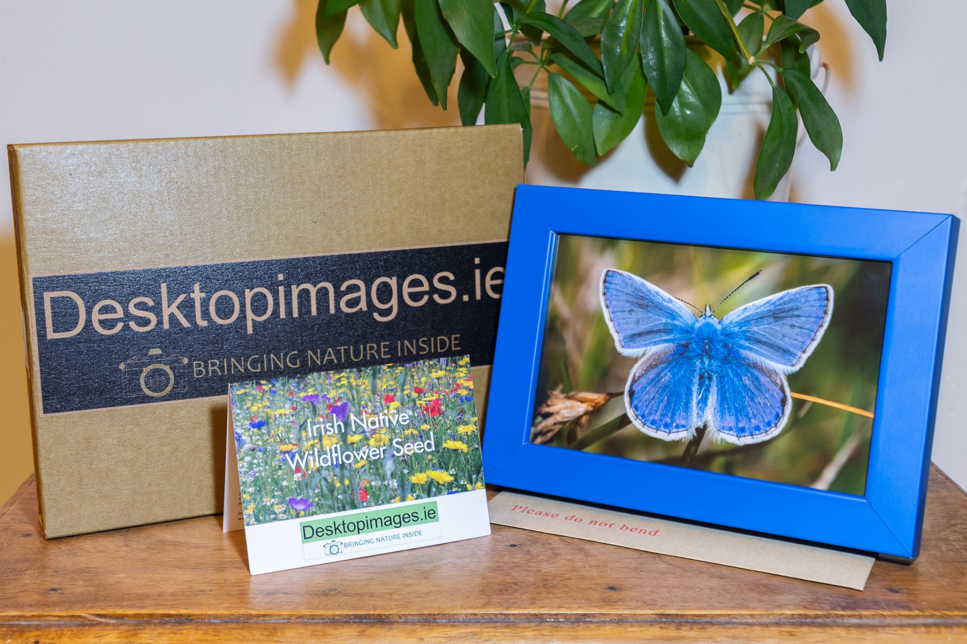 A selection of 6x4 nature photos with a pastel blue frame and a packet of Irish wildflower seeds.