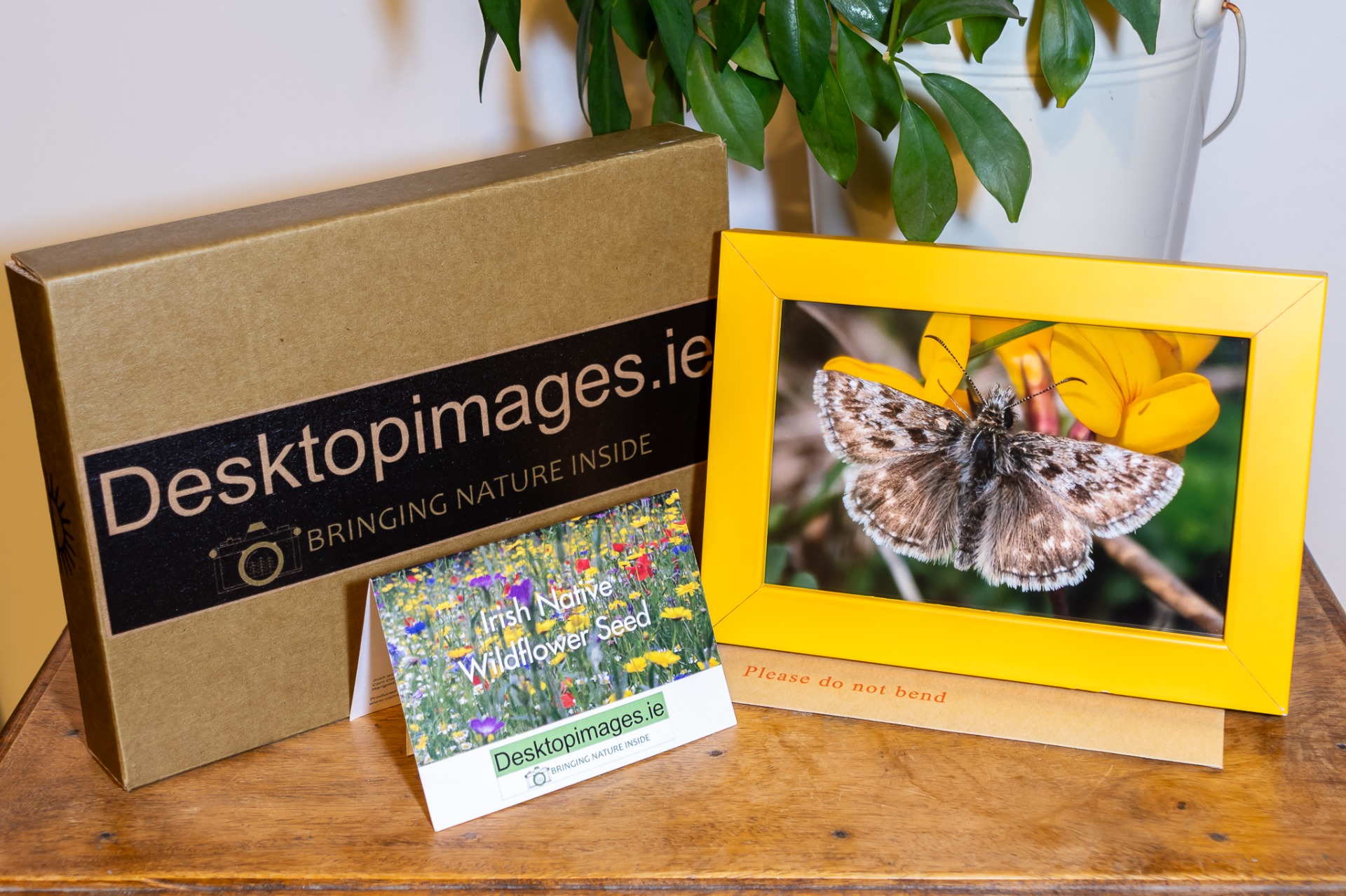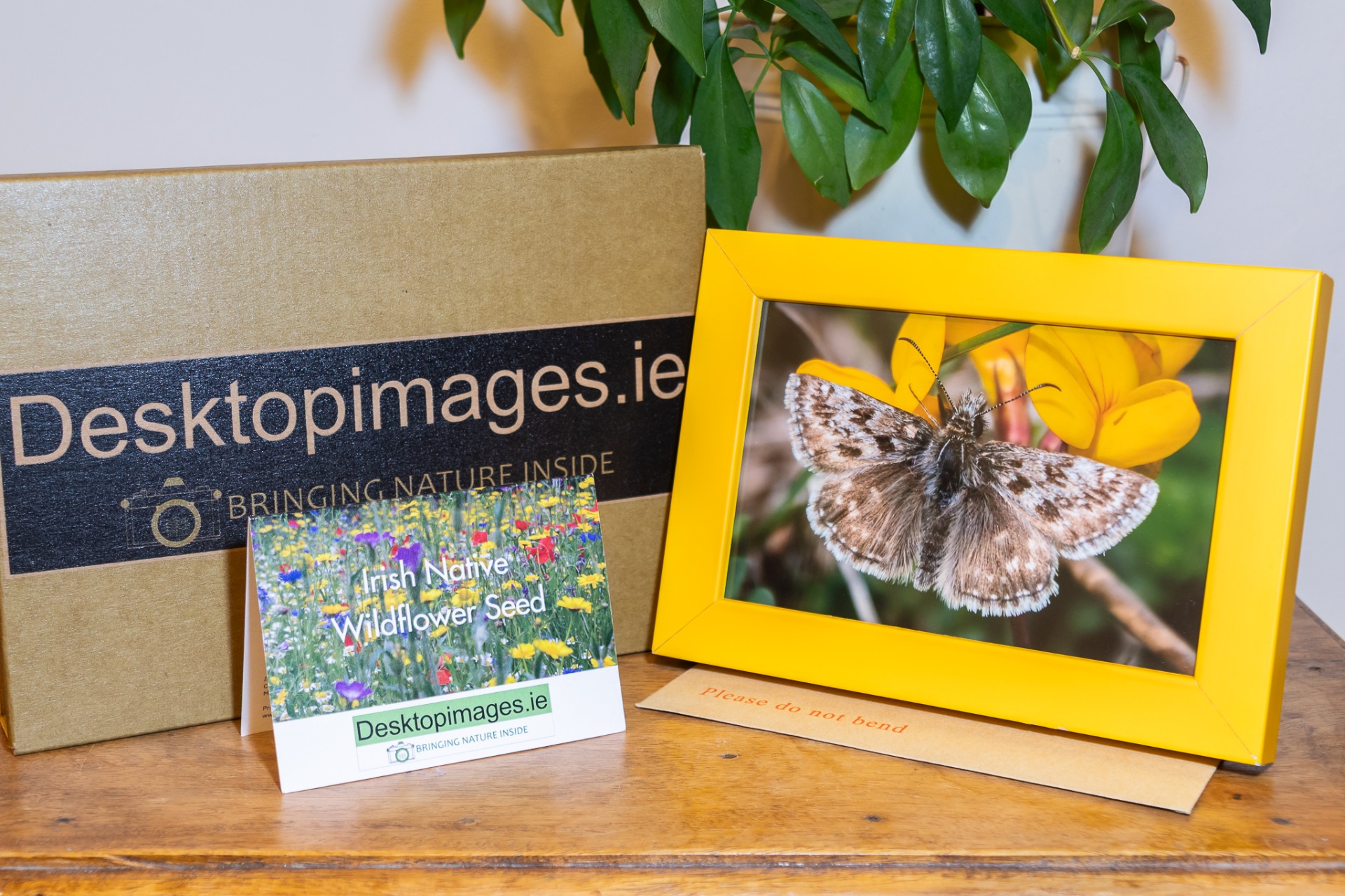 A selection of 6x4 photos with a pastel yellow frame and a packet of Irish wildflower seeds.