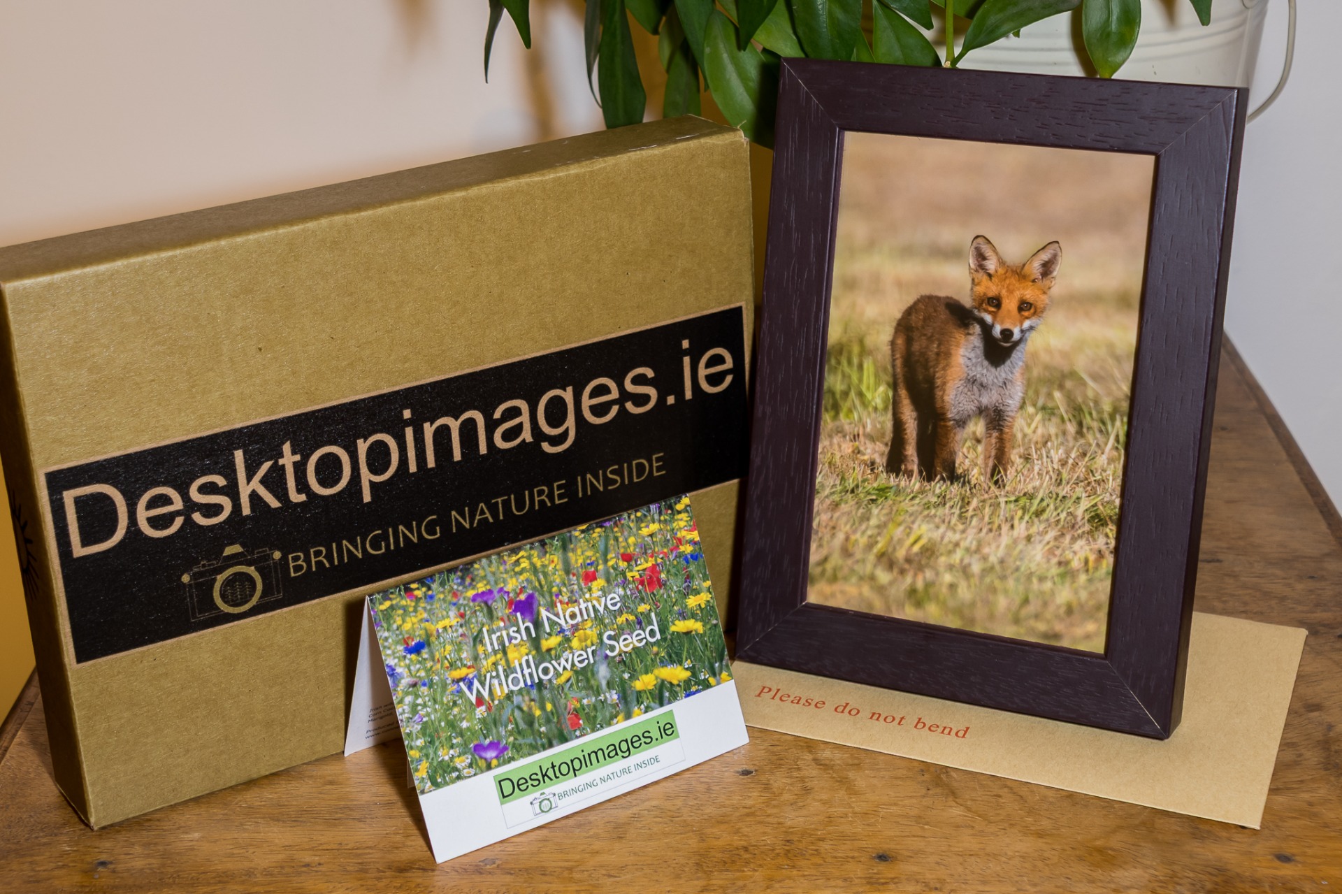 A selection of 6x4 Fox photos with a wenge-coloured frame and a packet of Irish wildflower seeds.