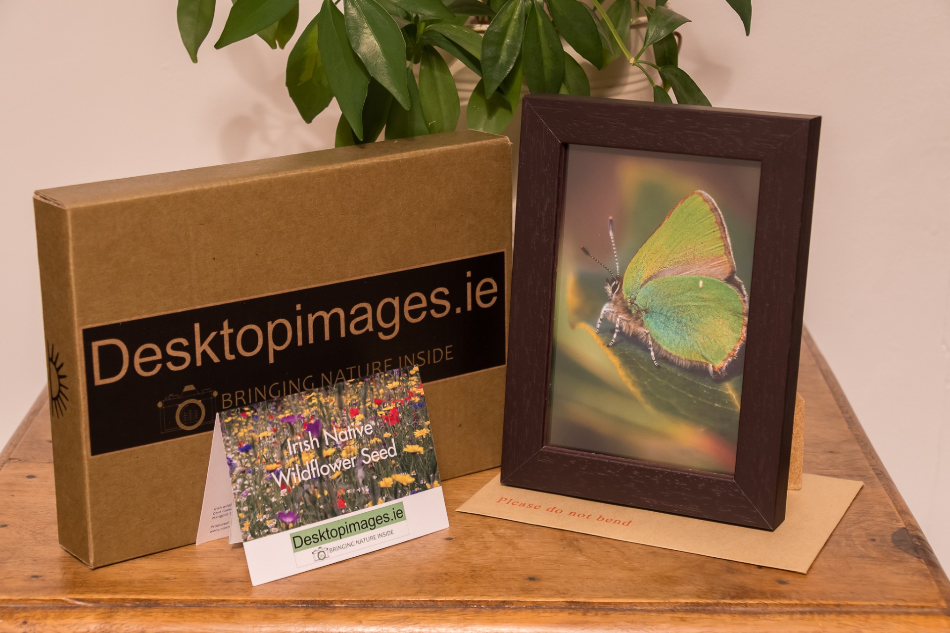 A selection of 6x4 Green Hairstreak butterfly photos, along with a wenge-coloured wooden frame and a packet of Irish wildflower seeds.