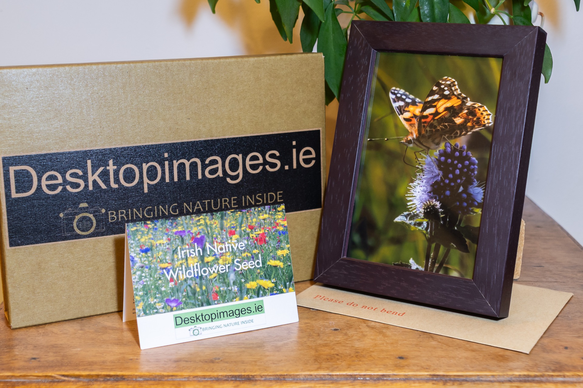 A selection of 6x4 Painted Lady butterfly photos with a wenge-coloured frame and a packet of Irish wildflower seeds.