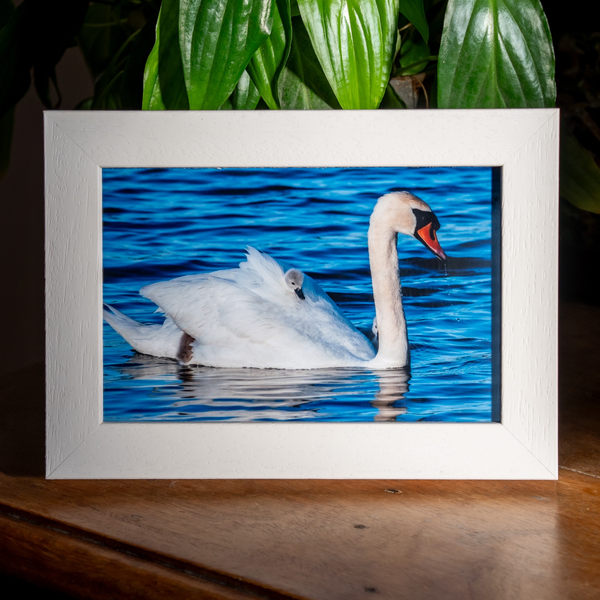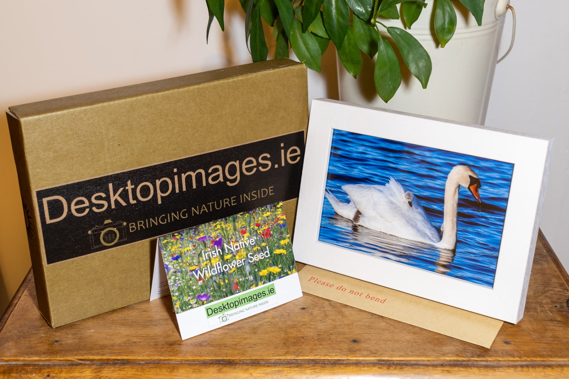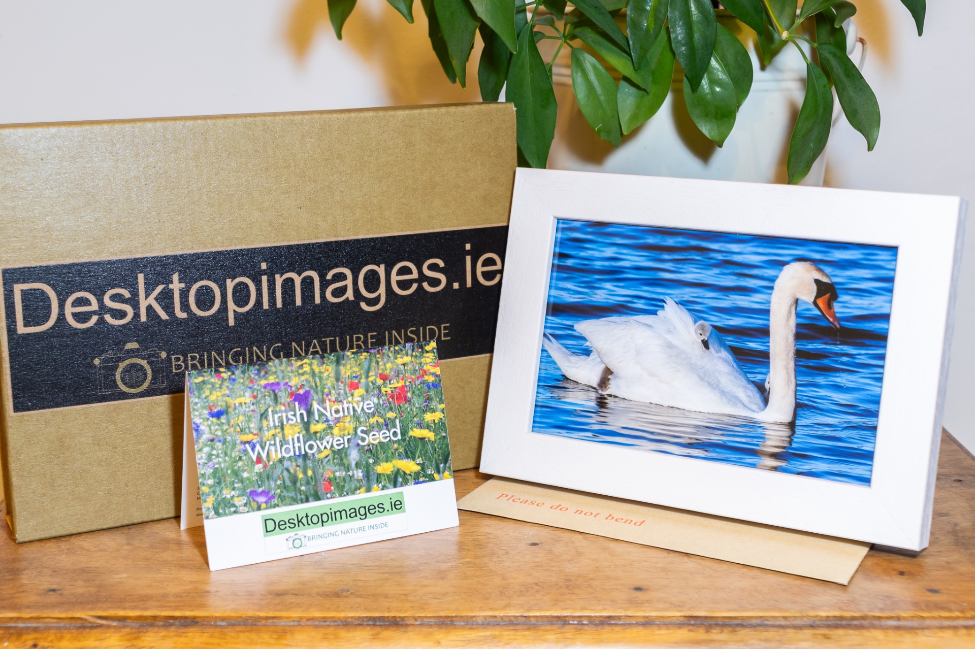 A selection of 6x4 Mute Swan photos with a white frame and a packet of Irish wildflower seeds.